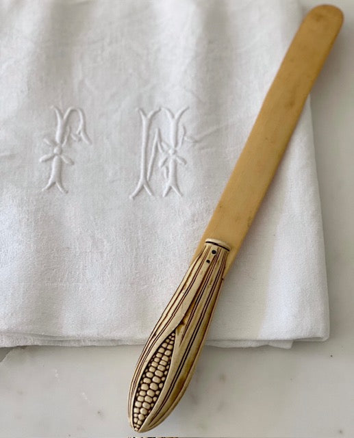 Vintage English page turner crafted in buttery yellow resin with delicate corn-husk handle accents. A playful and collectible piece, perfect for autumn decor or desk display.